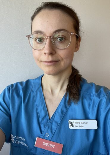 Jag heter Maria Ingmar och jobbar kliniskt som dietist på dietistenheten i Region Gävleborg, med placering i primärvården i Gävle. Vi har ett brett uppdrag och tar emot patienter från ett 40-tal hälsocentraler (både regiondrivna och privata) i Gästrikland och Hälsingland, samt att vi har viss samverkan med andra enheter såsom mödrahälsovård, vuxenhabilitering och kommunen (framför allt hemsjukvård).